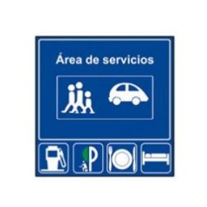 General indication sign S-127 indicates the place, within a highway or freeway, where a service area is located with the services indicated on the same panel: In this case a rest area, restaurant, hotel or motel and fuel pump.