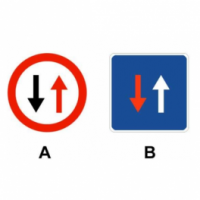 La señal vertical R-6 correspondiente en la fotografía a la señal B, indica a los conductores que en un próximo paso estrecho tienen prioridad de paso sobre los vehículos que circulan en sentido contrario. La señal R-5 en cambio, correspondiente a la señal A de la imagen indicará la prohibición de entrada en un paso estrecho mientras no sea posible atravesarlo sin obligar a los vehículos que circulen en sentido contrario a detenerse.