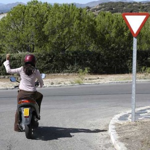 En esta intersección, la conductora del ciclomotor indica con el brazo que quiere…