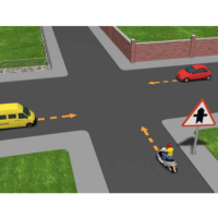 Según la norma general de preferencia de paso, la prioridad la tendrá el vehículo que se aproxima por la derecha, y debería pasar el turismo rojo, pero en este el ciclomotor tiene una señal vertical de prioridad en la vía que circula, que le ofrece prioridad de paso sobre el resto de vehículos que circulen por la transversal.