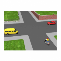 En una intersección sin señalizar como la que encontramos en la imagen, el Reglamento de Circulación nos dice que tendrá prioridad de paso el vehículo que tenga su derecha libre, en este caso el turismo rojo o, lo que es lo mismo, se deberá ceder el paso al vehículo que aparezca por nuestra derecha. Así pues la furgoneta amarilla cederá el paso al ciclomotor, y el ciclomotor al turismo rojo, que será el que pase en primer lugar.