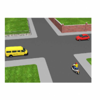 Así pues la furgoneta amarilla cederá el paso al ciclomotor, y el ciclomotor al turismo rojo, que será el que pase en primer lugar.