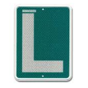 La placa "L" es rectangular, reflectante, de fondo verde y con la letra "L" en blanco, y debe estar colocada en un sitio visible de la parte posterior izquierda del vehículo.