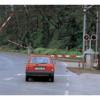 Los usuarios de la vía que al llegar a un paso a nivel o a un puente levadizo lo encuentren cerrado o con la barrera o semibarrera en movimiento, deberán detenerse uno detrás de otro en el carril correspondiente hasta que tengan paso libre. Así pues en este caso nos detendremos en el carril derecho, detrás del vehículo rojo de la imagen.