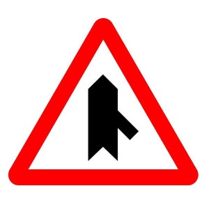 Esta señal advierte de peligro por la proximidad de una intersección con prioridad de incorporación por la derecha (P-1b). Pueden entrar vehículos desde ese lado, por lo que debes reducir la velocidad y extremar la atención.