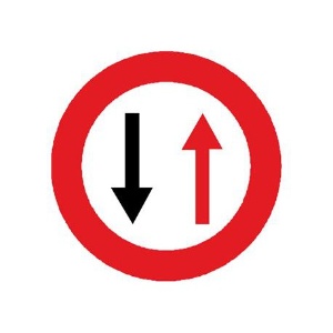 Esta señal, para el vehículo que se la encuentra de frente en un estrechamiento, indica que está prohibido pasar si obligamos al vehículo que viene de frente a detenerse. Por tanto, tiene prioridad el vehículo que viene por el otro lado del estrechamiento.