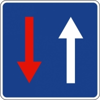 Esta señal indica, para el conductor que se la encuentre de frente, que se tiene prioridad en el estrechamiento. En este caso, por tanto, tiene prioridad el autobús y el camión debe retroceder.