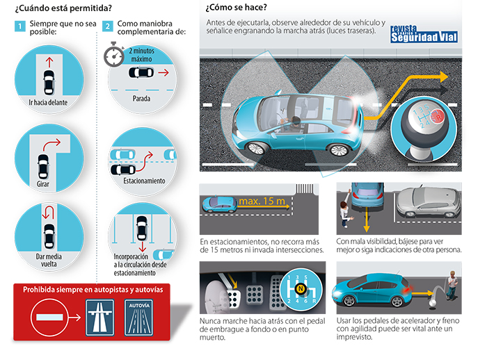 Está prohibido circular marcha atrás pero existen ciertos casos en que está permitido: en los casos en que no sea posible marcha hacia delante o cambiar de dirección o como maniobra complementaria de otra que lo exija.