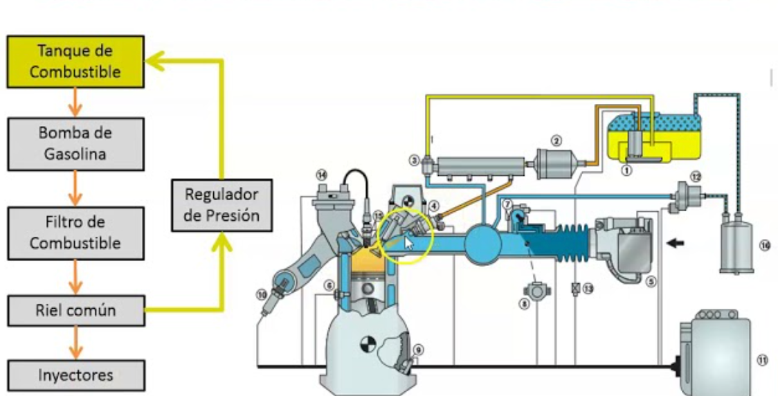 Los elementos del sistema de inyección miden el aire y proporcionan la cantidad de gasolina necesaria. Los inyectores van colocados en el colector de admisión por lo general.