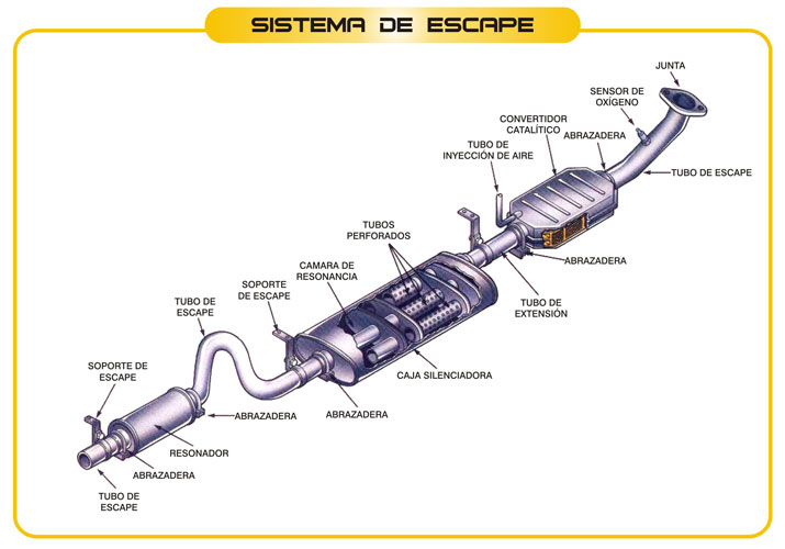 - Catalizador: Se encarga de reducir las concentraciones de gases nocivos (Monóxido de carbono, Óxidos de nitrógeno y Hidrocarburos sin quemar).