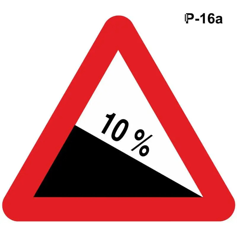 La señal P-16a advierte de una bajada con pendiente, mientras que la señal P-16b indica una subida con fuerte pendiente.