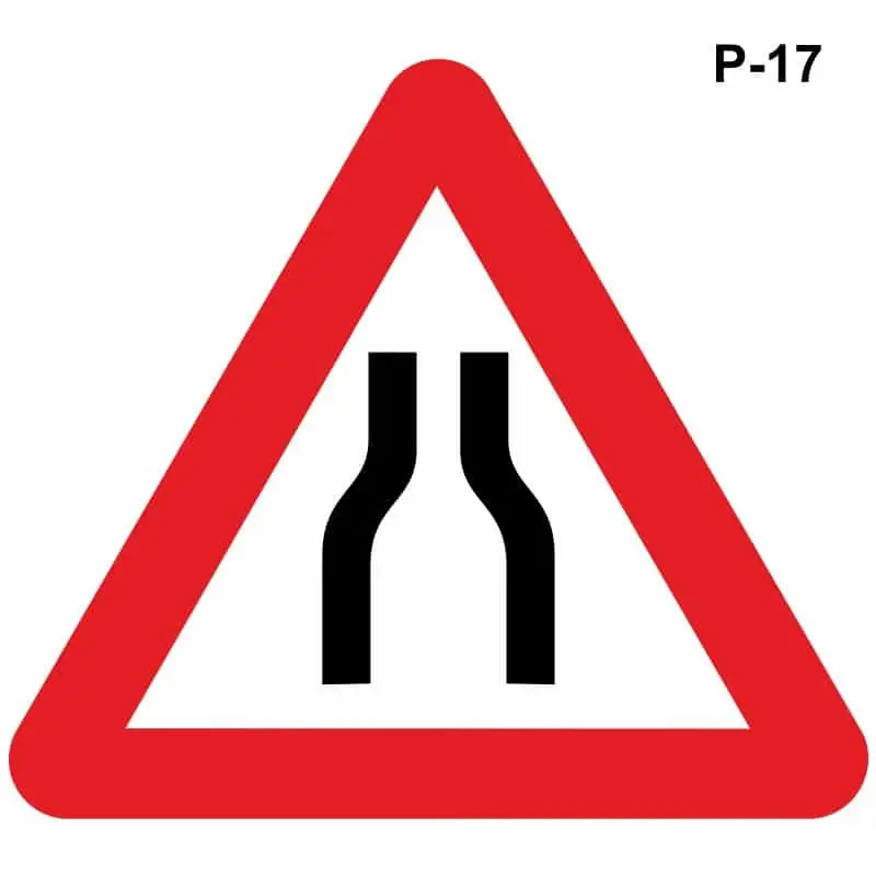Los conductores son advertidos de este peligro mediante las señales P-17, que indica un estrechamiento por ambos lados, la señal P-17a que indica un estrechamiento por la derecha y la P-17b que lo indica por la izquierda.
