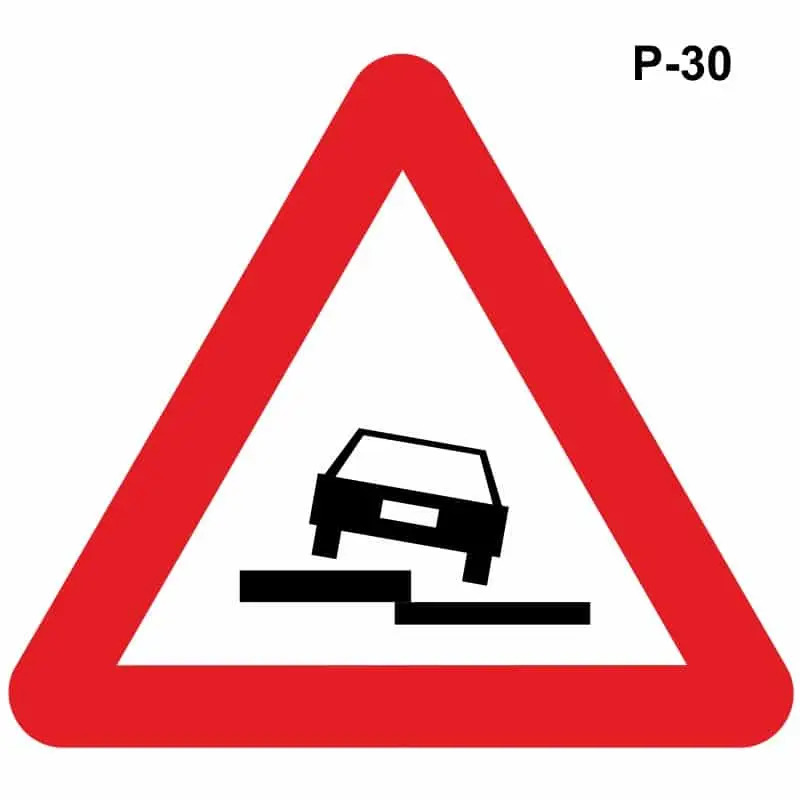 La señal P-30 advierte de un peligro ocasionado por un desnivel o escalón lateral en la vía.