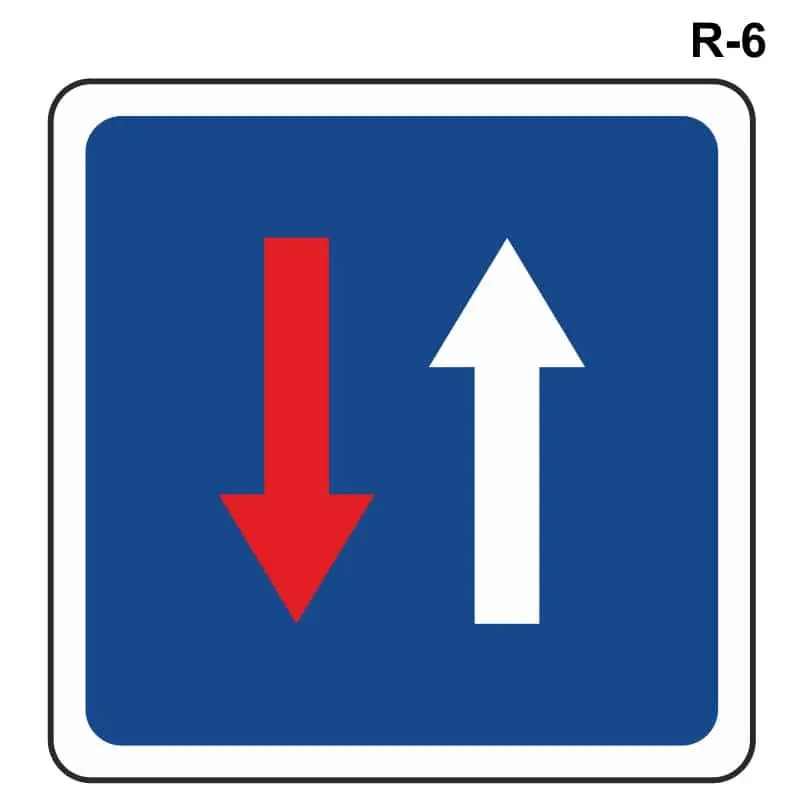 La señal R-6 por su parte informa de que en el próximo paso estrecho tienen prioridad de paso respecto a los vehículos que circulan en sentido contrario.