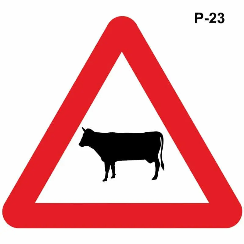 La señal P-23 advierte de que la vía puede ser atravesada por animales domésticos, y la P-24, animales en libertad.