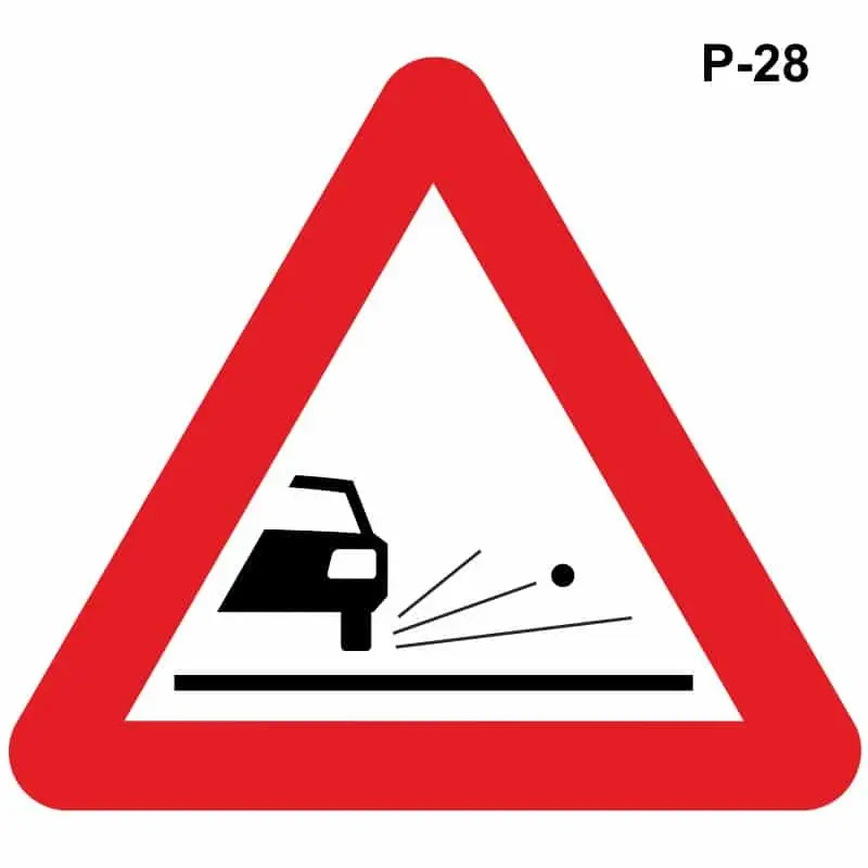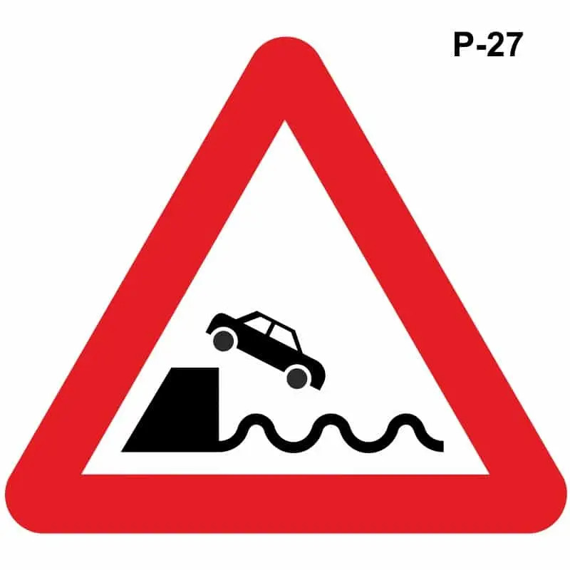 Por su parte la señal P-27, advierte de que la vía por la que circulamos desemboca en un muelle o corriente de agua.