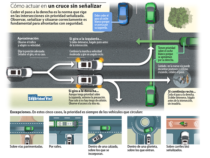Cuando nos encontremos ante una intersección sin preferencia señalizada por los elementos anteriores, estaremos obligados a ceder el paso a los vehículos que se aproximen por nuestra derecha excepto si nos encontramos en alguna de las siguientes situaciones: